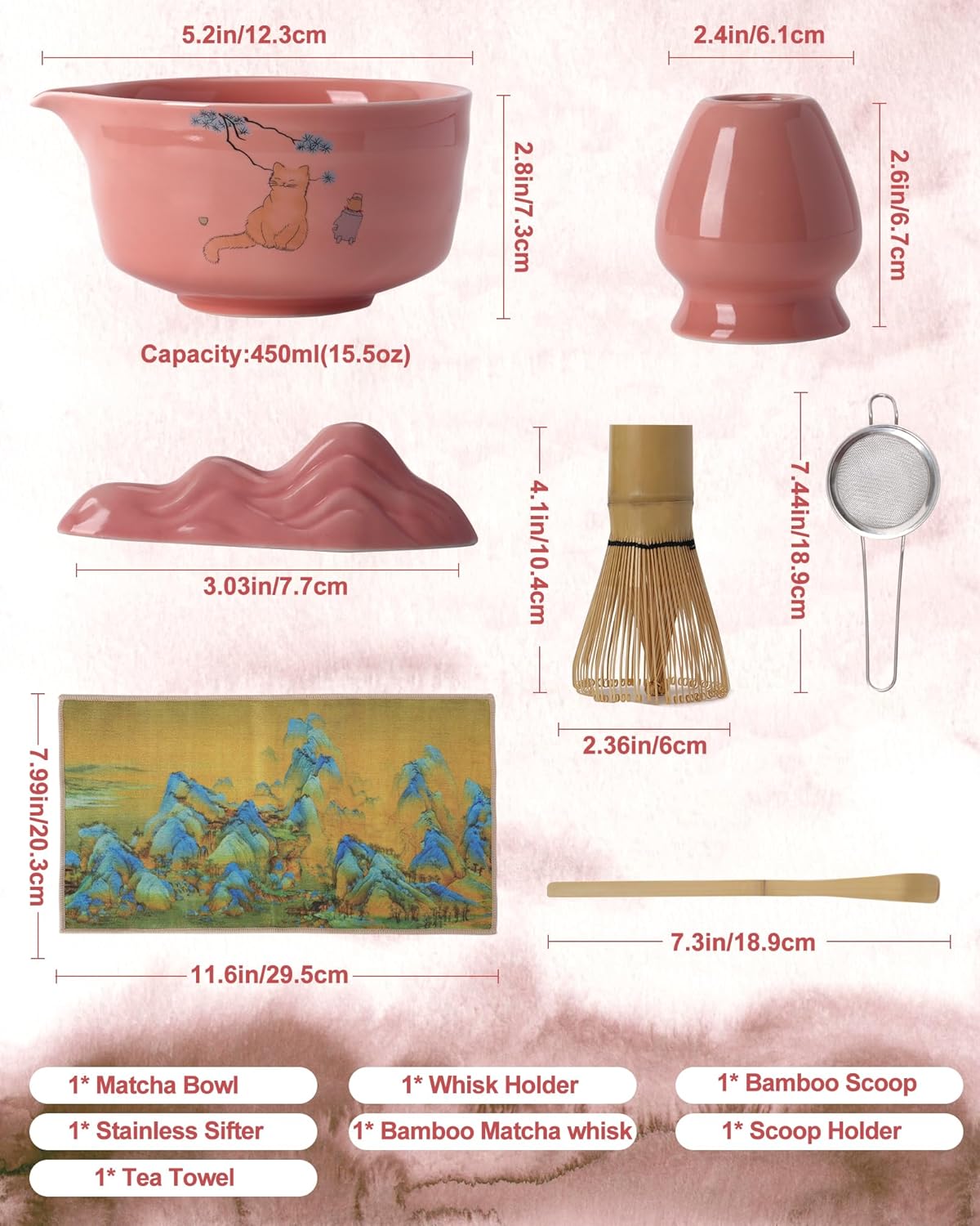 - 7-PCS MATCHA WHISK SET: 1*Ceramic Bowl whith Spout(chawan) 450 Ml/15.22 Oz, 1*Bamboo Whisk, 1*Bamboo Scoop (chashaku), 1*Cermaic Whisk Holder, 1*Ceramic Scoop Stand, 1*Cotton Tea Cloth (chakin), 1*Matcha Powder Sifter.Includes All Accessories.Elevate your tea ritual with our thoughtfully curated collection, perfect for both enthusiasts and newcomers to the world of matcha.