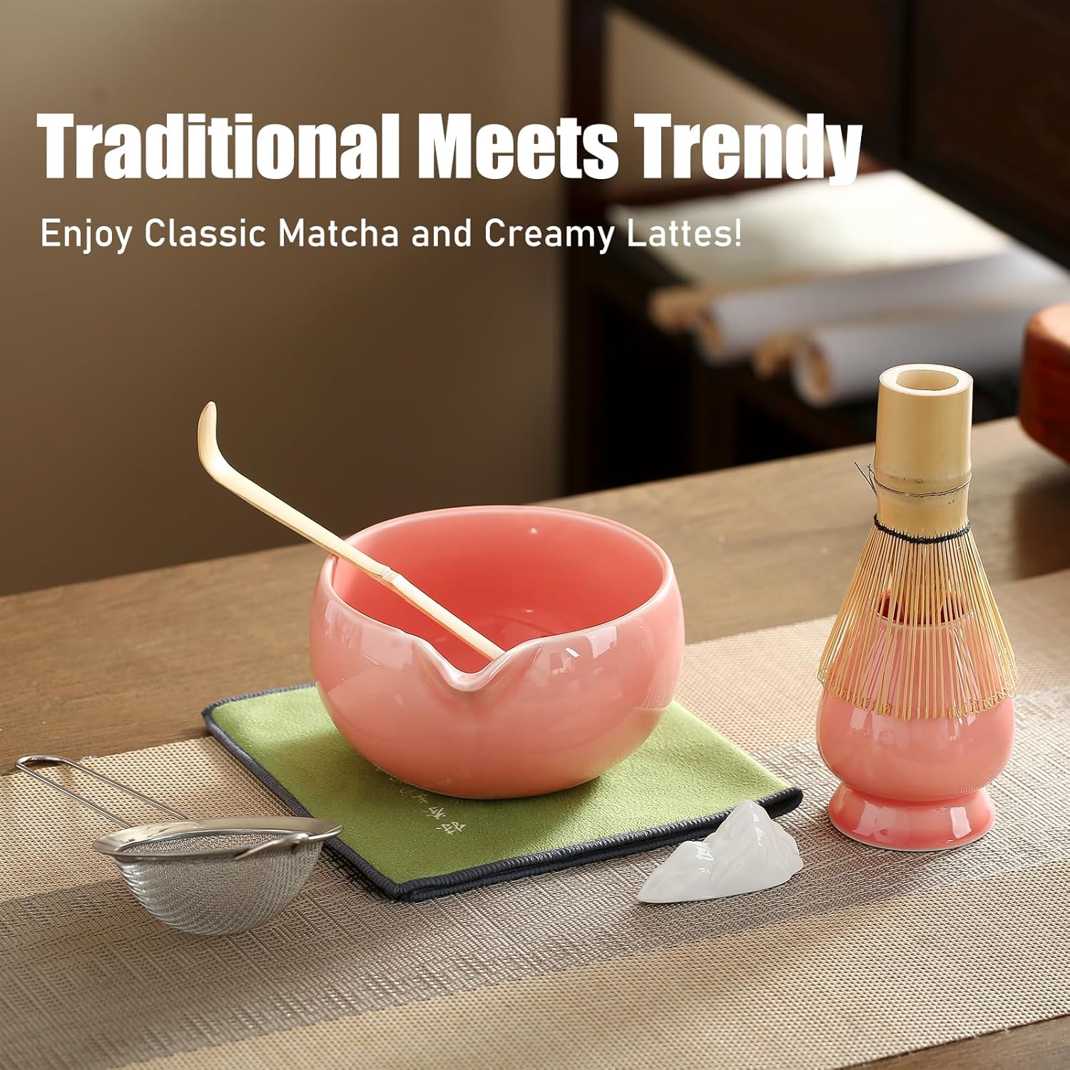 - 7-Pcs Matcha Whisk Set Include: 1*500ml/18oz Ceramic Matcha Bowl with Spout (chawan) , 1*Bamboo Whisk, 1*Bamboo Scoop (chashaku), 1*Cermaic Whisk Holder, 1*Ceramic Scoop Stand, 1*Cotton Tea Cloth (chakin), 1*Matcha Powder Stainless Sifte