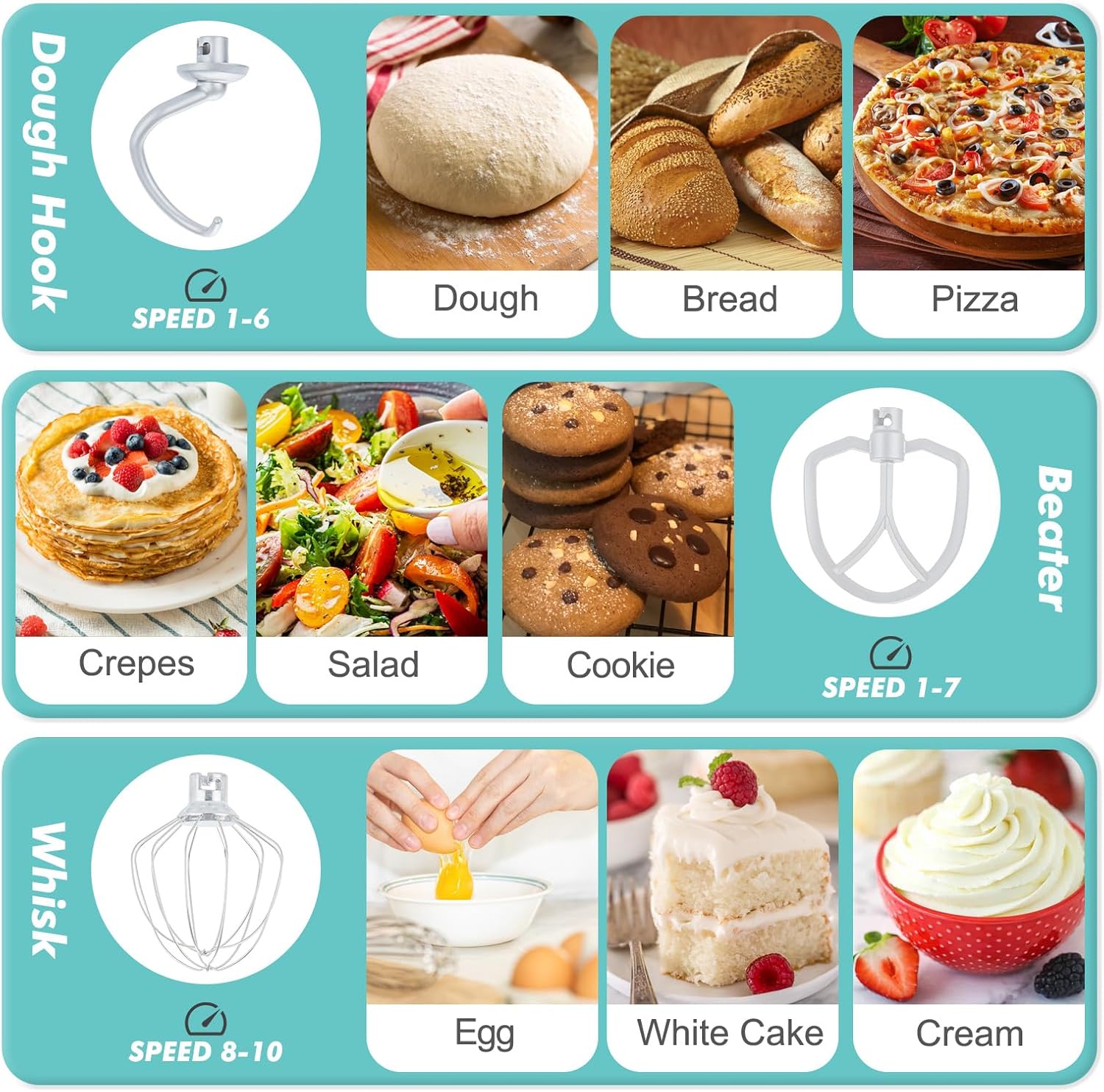 - ăDurable Attachments & Dishwasher SafeăAs a versatile food mixer it includes coated aluminum dough hooks & beaters, plus a stainless steel whisk for lasting performance. All attachments snap on and off in seconds for quick changes during baking. The stainless steel bowl and all attachments are dishwasher safe (top rack recommended), ensuring quick and hassle-free cleanup.
