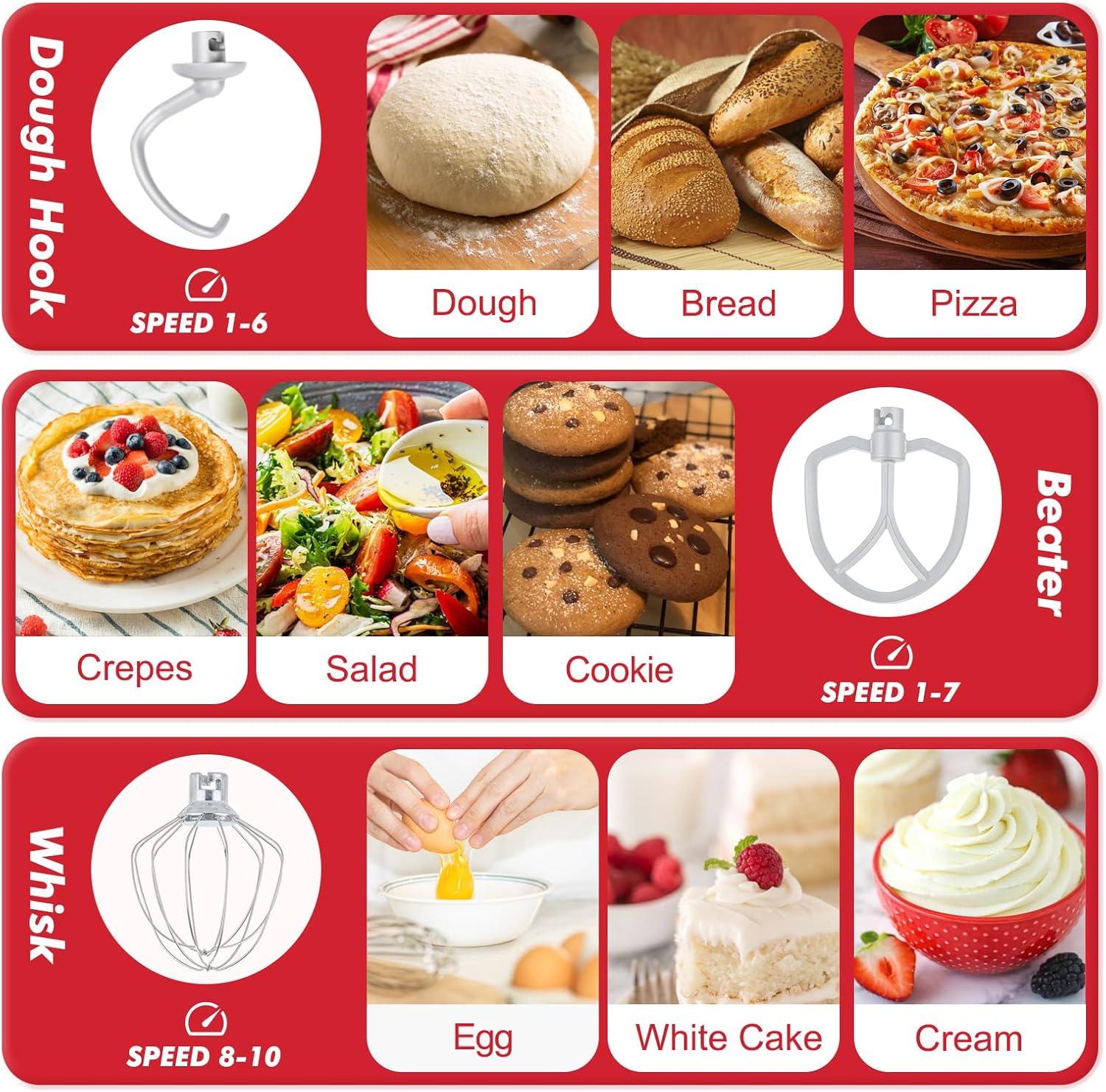 - ăDurable Attachments & Dishwasher SafeăAs a versatile food mixer it includes coated aluminum dough hooks & beaters, plus a stainless steel whisk for lasting performance. All attachments snap on and off in seconds for quick changes during baking. The stainless steel bowl and all attachments are dishwasher safe (top rack recommended), ensuring quick and hassle-free cleanup.