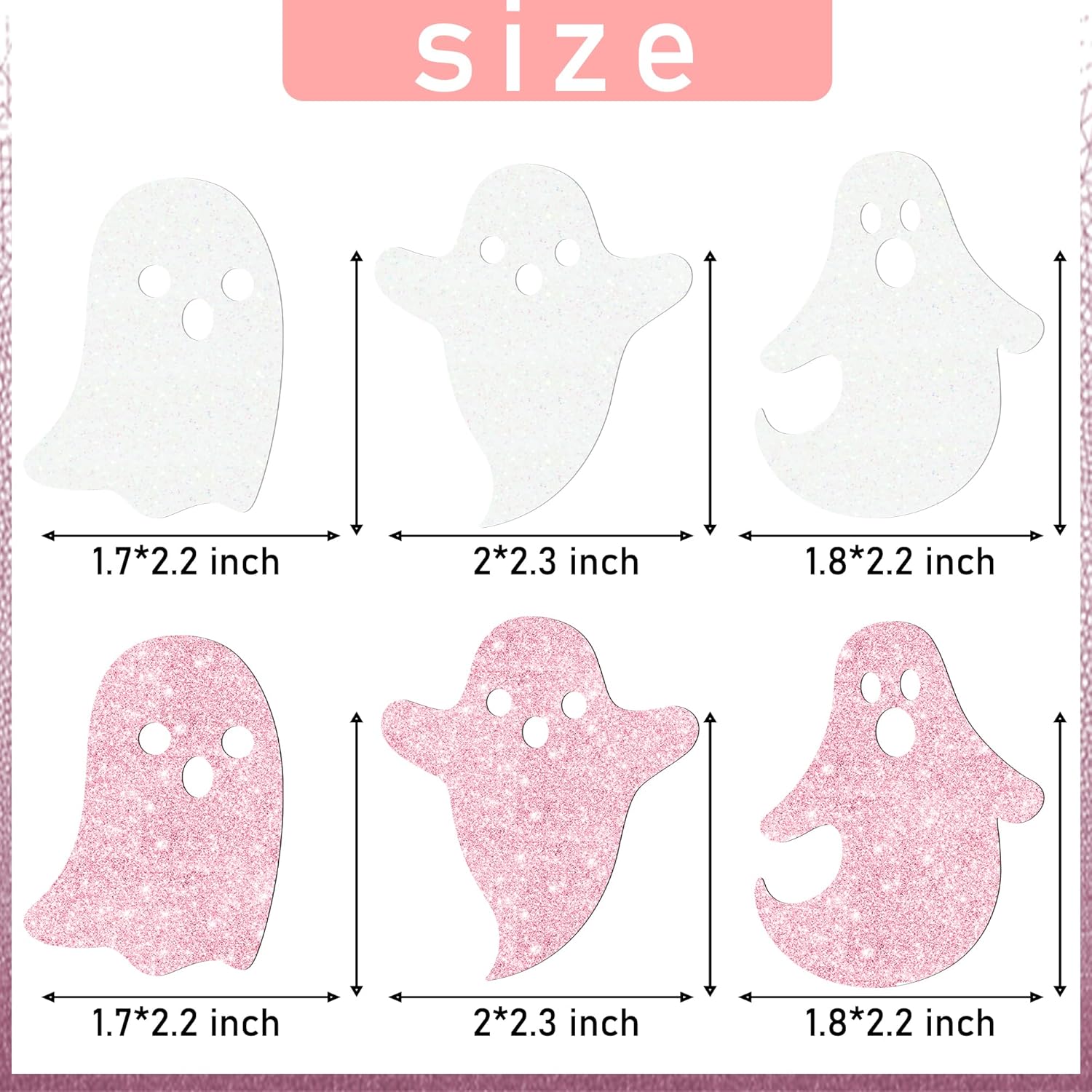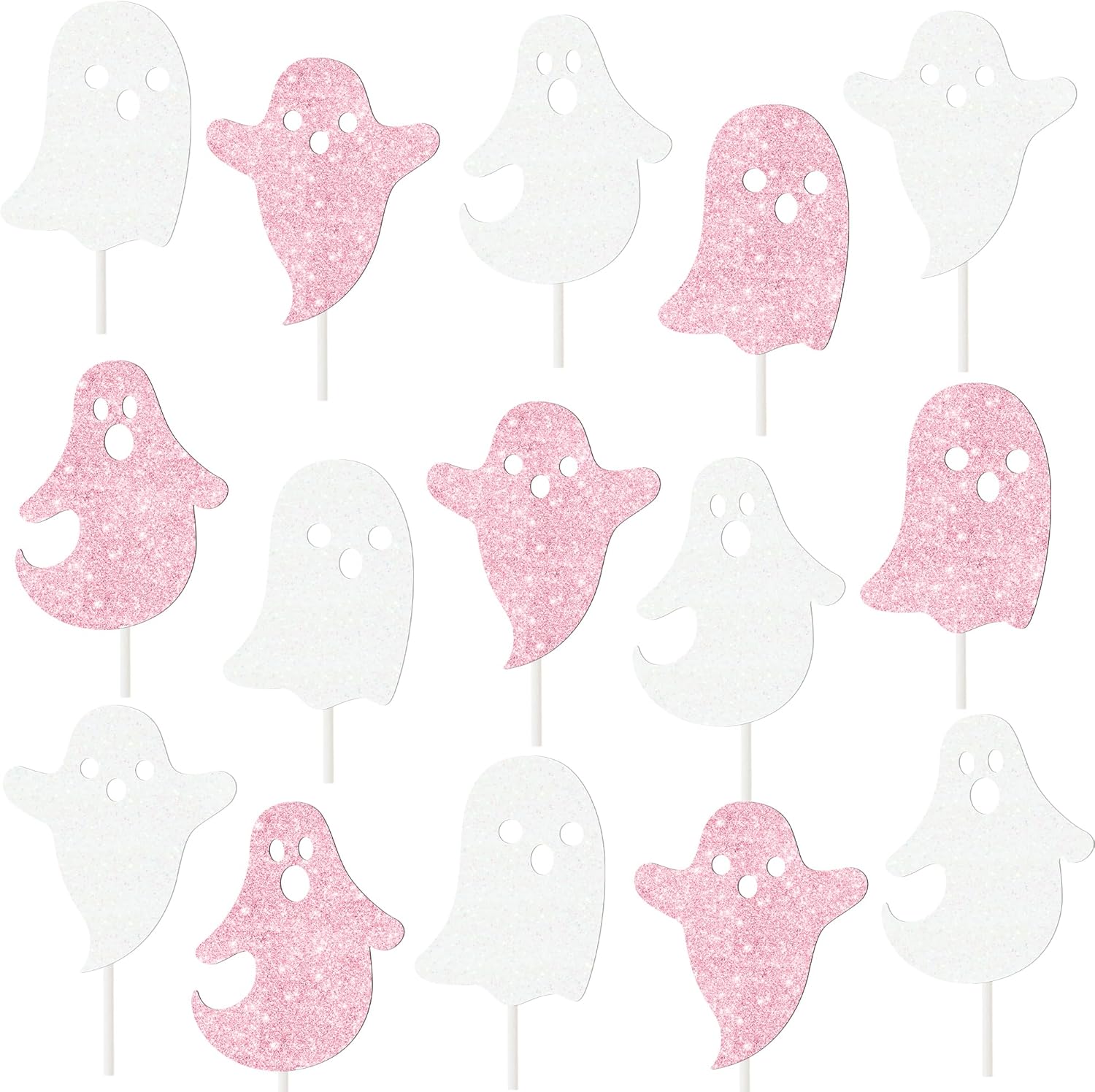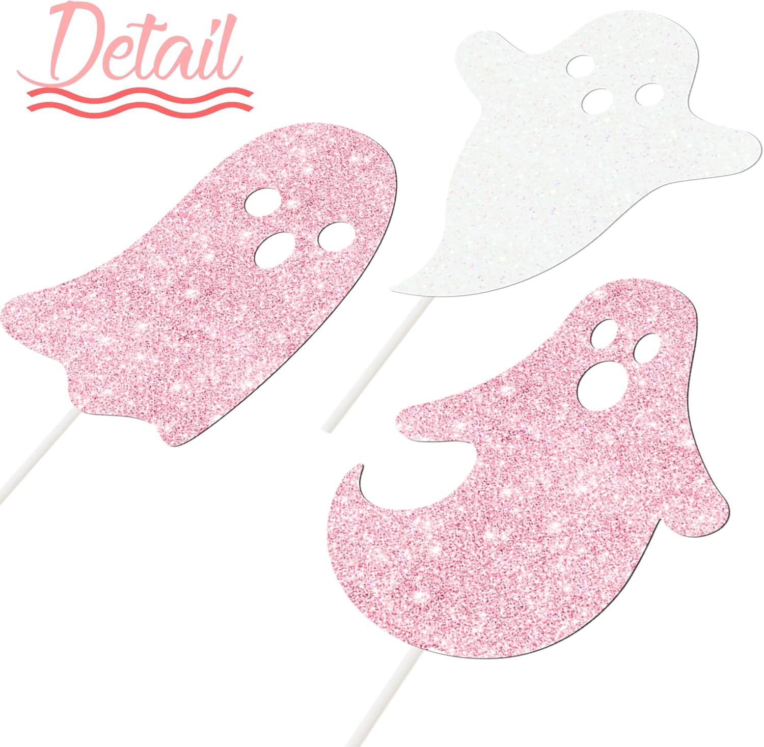 Halloween Ghost Cupcake Decoration 24Pcs Ghost Cupcake Toppers Double Sided Glitter White Pink Halloween Birthday Baby Shower Supplies for Ghost Boo Theme Party Cake Decor