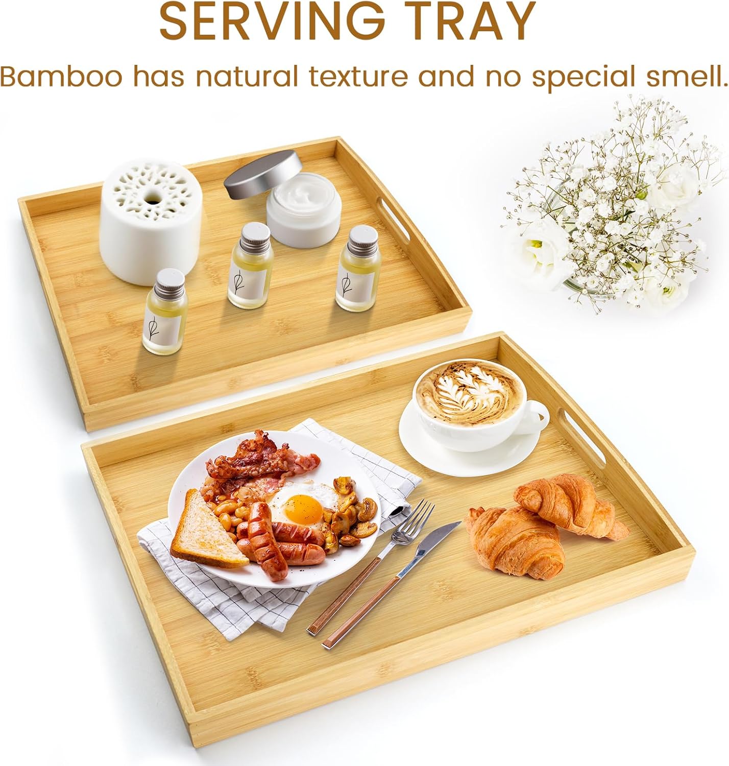 GOLD HONEY Bamboo Serving Tray with Handles Set of 2 - Decorative Wooden Tray for Living Room, Bathroom, Suitable for Used in Bedroom, Kitchen, Coffee Table, Outdoor and Storing - 17x13in, 16x12in