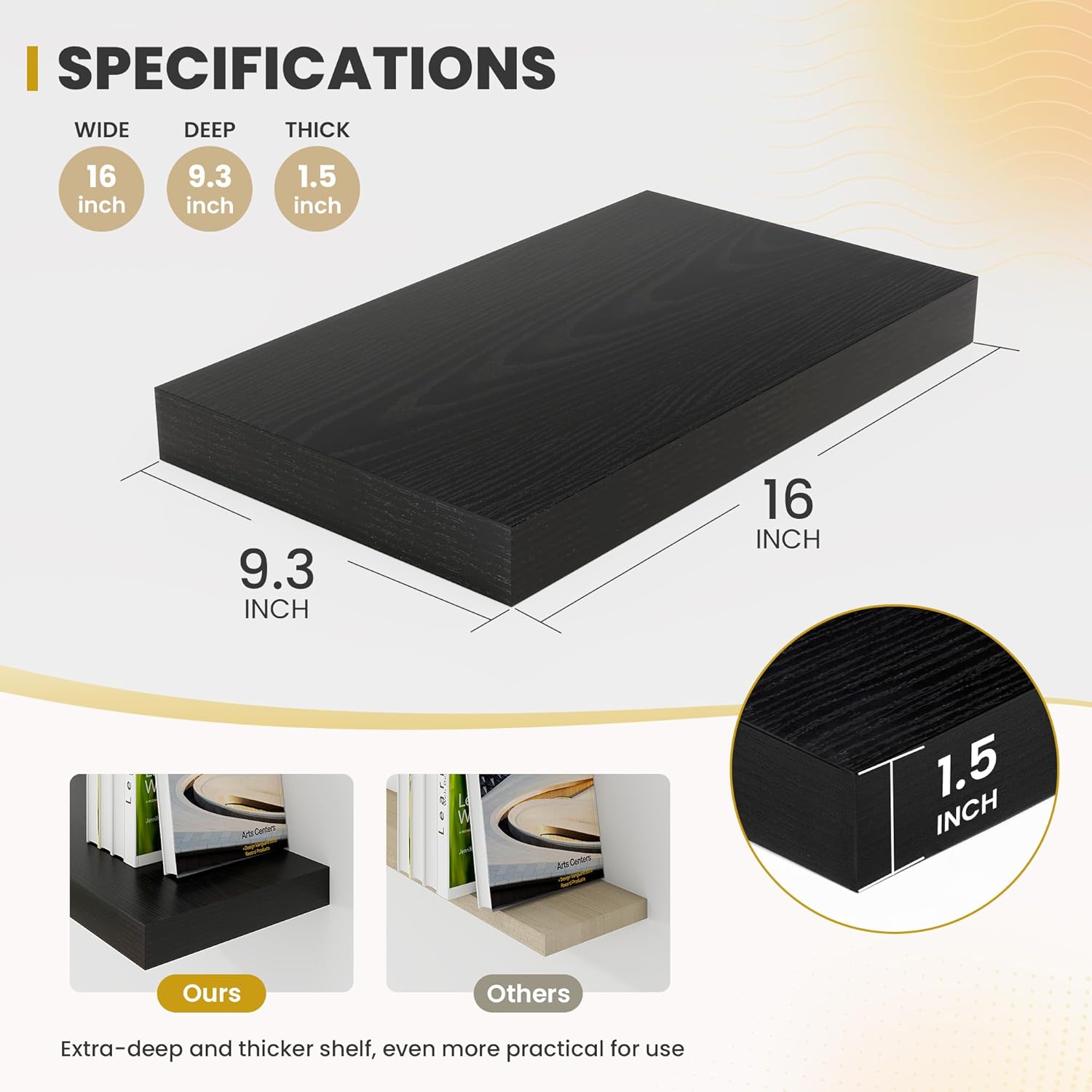 16 Inch Floating Shelves, 9.3" Deep Floating Shelf Wall Mounted, 16" Wall Shelves, Rustic Deep Bookshelf, Large Display Shelves & Storage Shelves for Bedroom, Living Room, Black, Set of 2