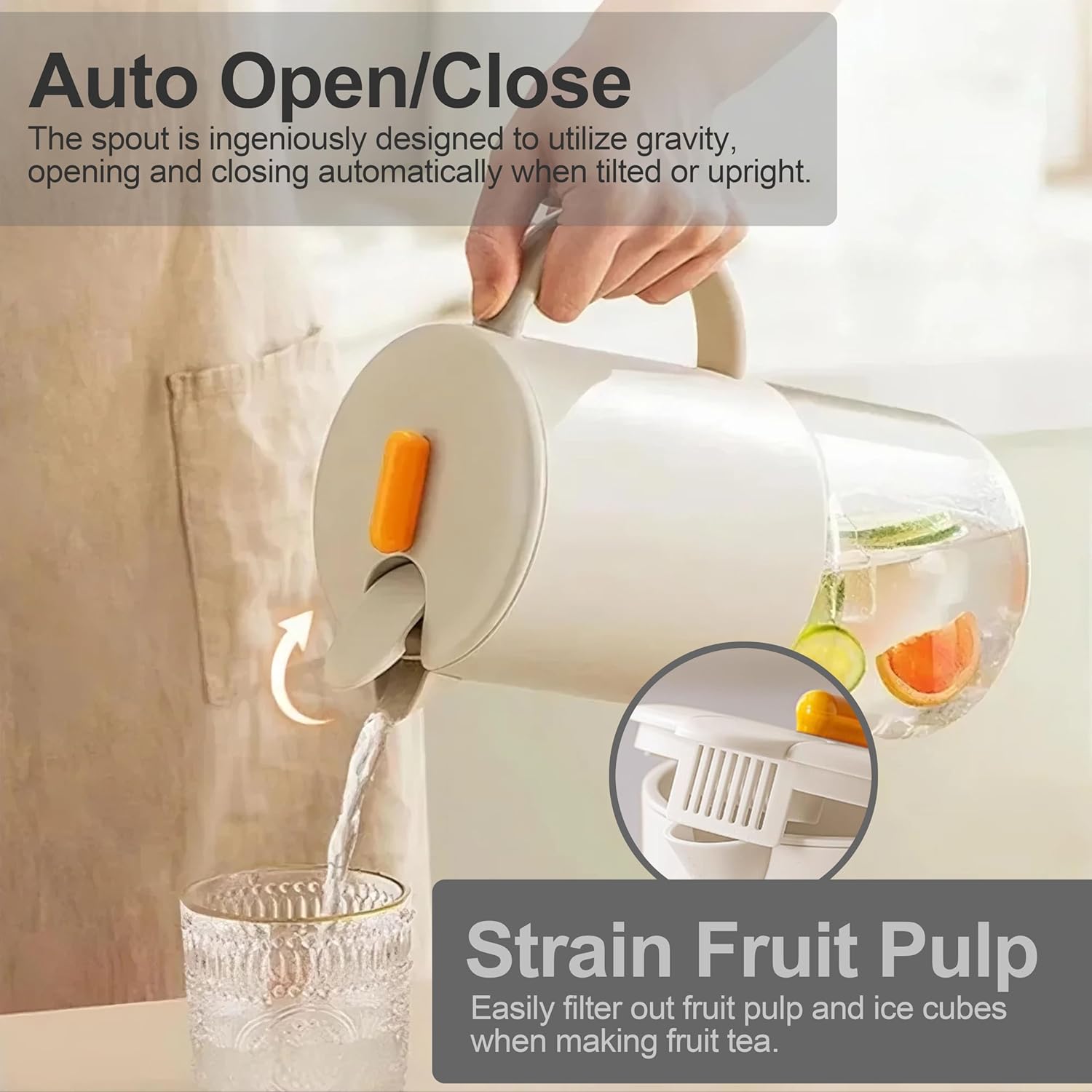 Delove Borosilicate Glass Pitcher with Lid & Auto Spout – Shatterproof Plastic Shell, Wide Mouth Design – 62 oz (1.9 Quart) Jug for Cold/Boiling Water, Iced Tea, Juice (1, Beige)