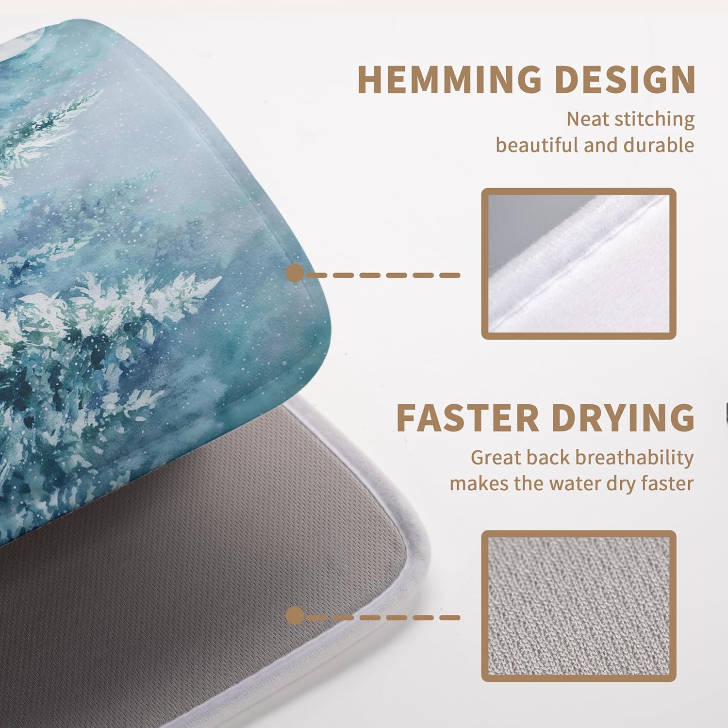 - [Space Saving]: This Winter Pine Tree lightweight absorbent dish drying mat has a webbing lanyard in the middle of the horizontal side for hanging, and large drying mat for kitchen counter Christmas Snow Forest dish drying matt kitchen counter can also be folded and thrown into a drawer or stuffed elsewhere.