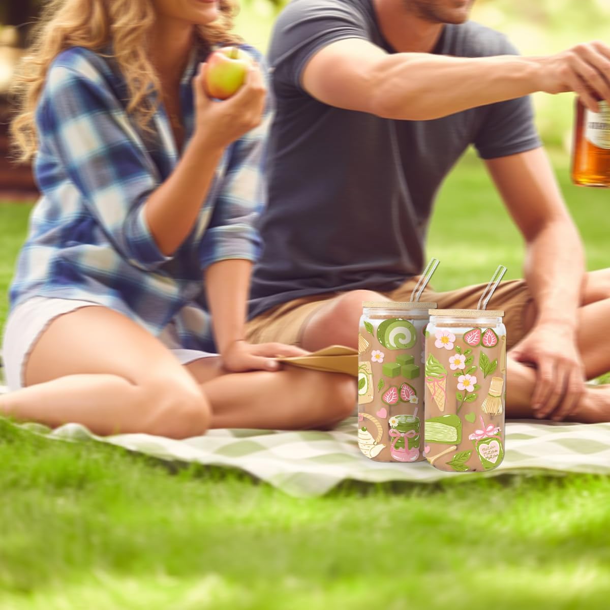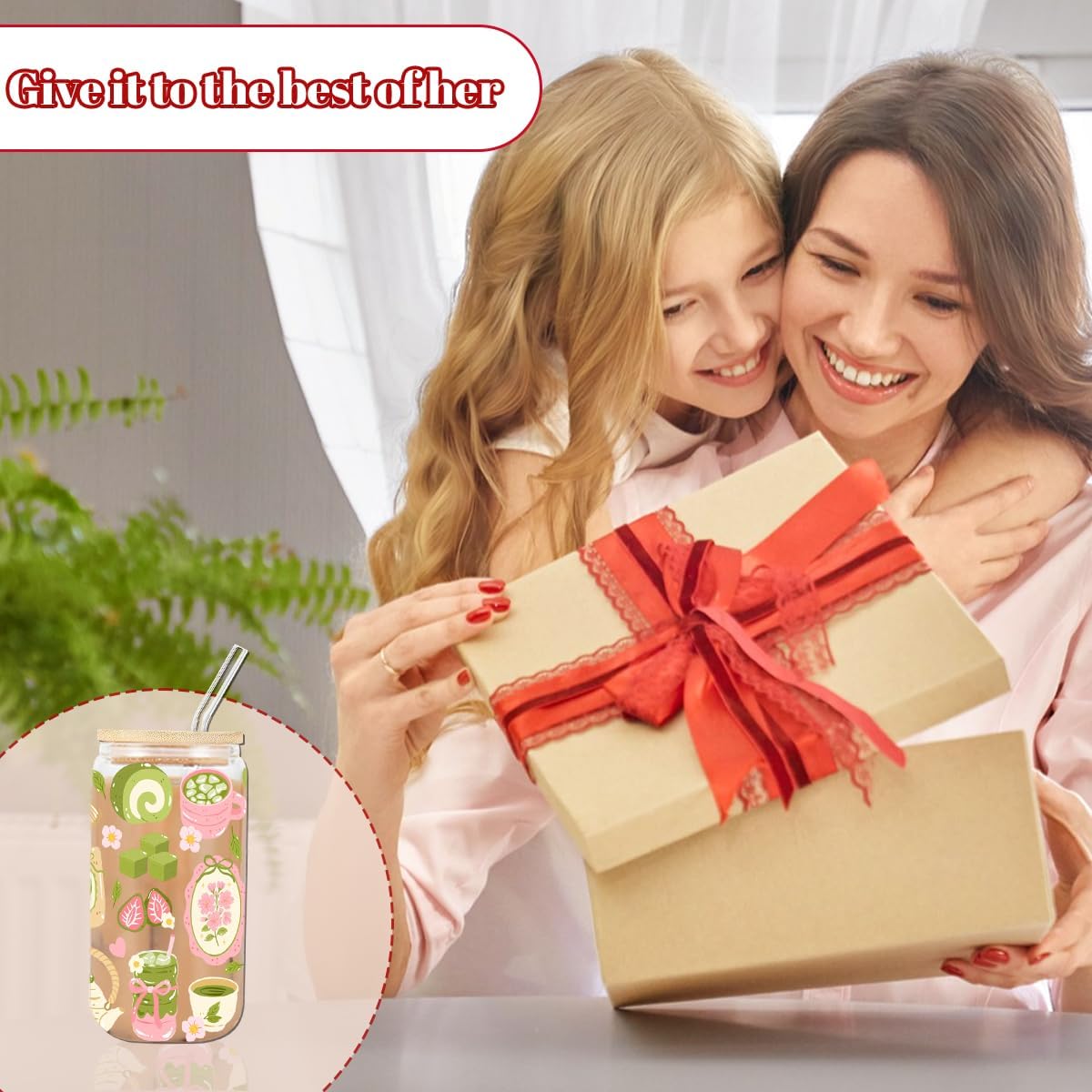 Matcha Girly Glass Cup, Matcha Lovers Gift, Kawaii Latte Girly Glass Tumbler, 16 oz Cafe Aesthetic Iced Coffee Cup with Lid Straw
