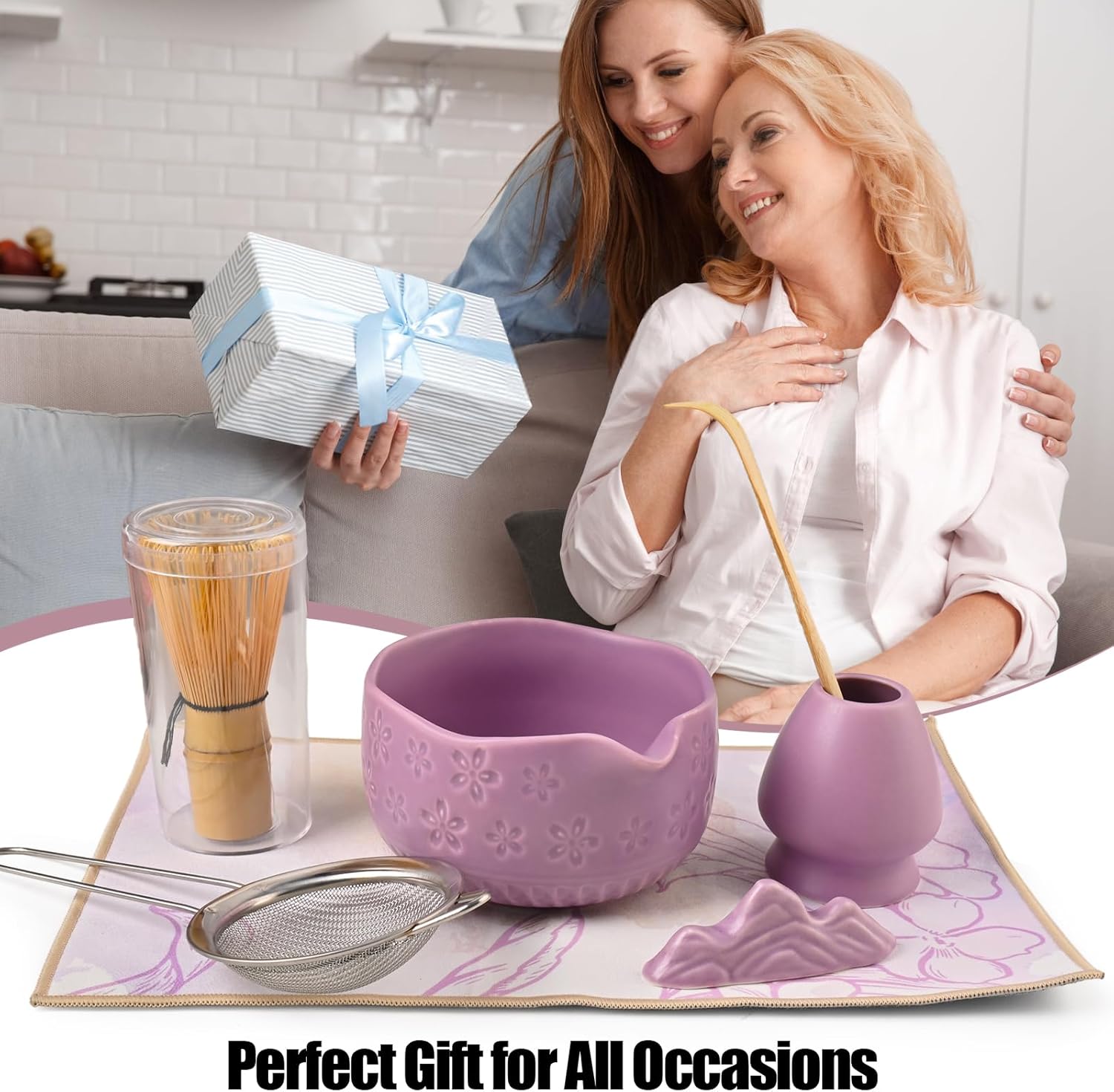 Matcha Whisk Set - Traditional Japanese Handmade Bamboo Matcha Whisk and Holder, Matcha Bowl,Bamboo Scoop, Scoop Rest, Sifter and Tea Towel (Purple)