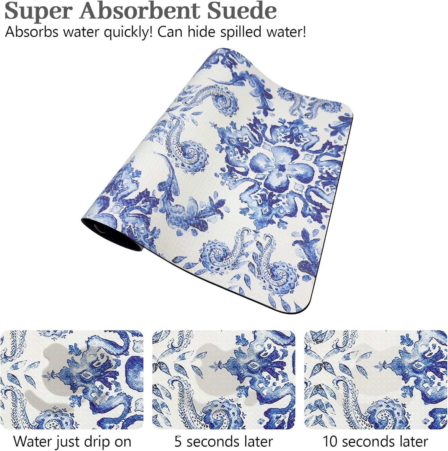 Bloss Dish Drying Mat, Multiple Usage Coffee Bar Mat, Kitchen Counter Mats, Absorbent Hide Stain Rubber Backed Dish Drying Pad(16.1"x24.1", Ink Cyan Flower)