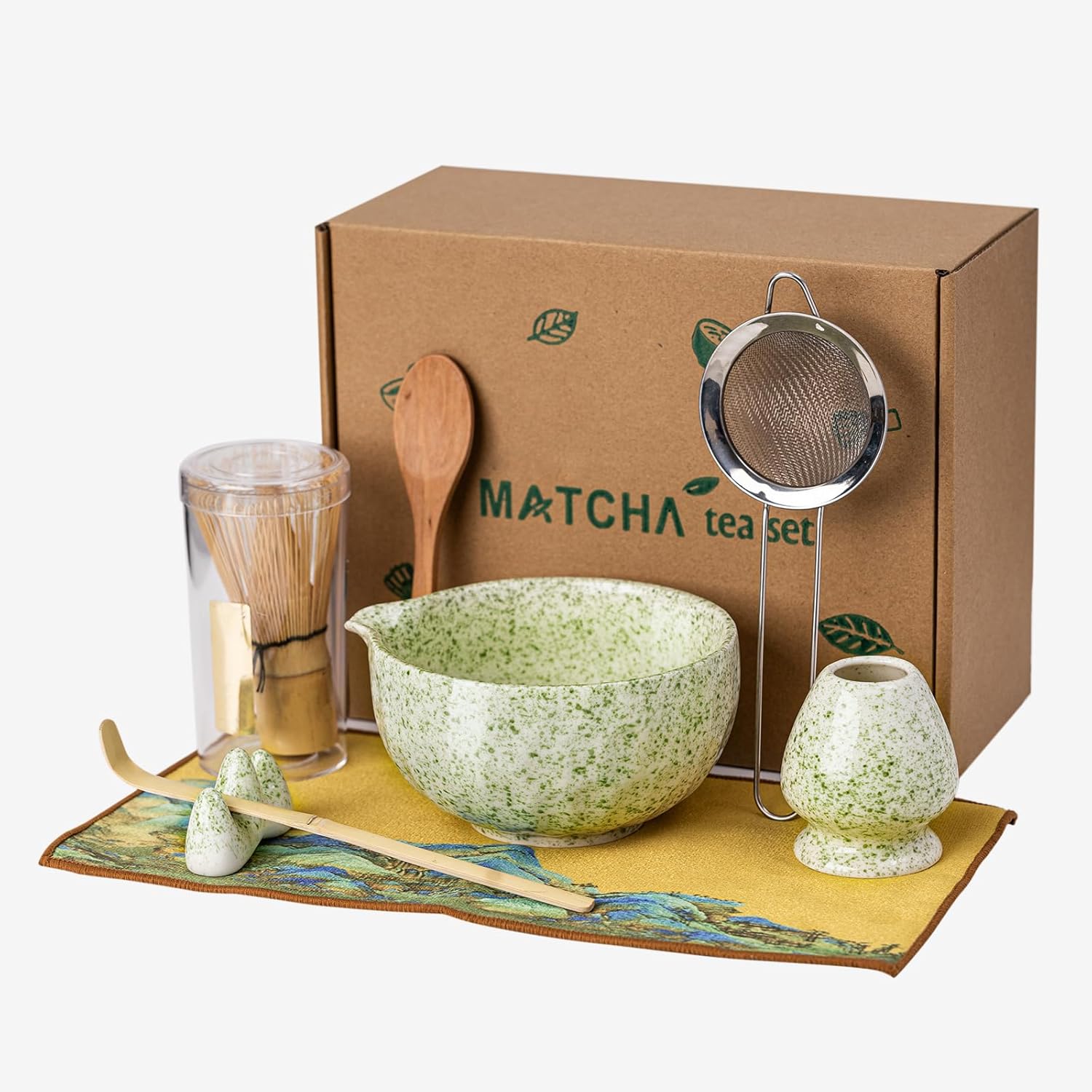 - 【MATCHA WHISK SET】This Japanese matcha kit includes essentials for an authentic matcha experience: 1* bamboo matcha whisk, 2* bamboo scoop, 1* scoop rest, 1* stainless steel sifter, 1* 530 ml/18 oz ceramic matcha bowl with pouring spout (Chawan), 1* whisk holder, 1* tea towel.