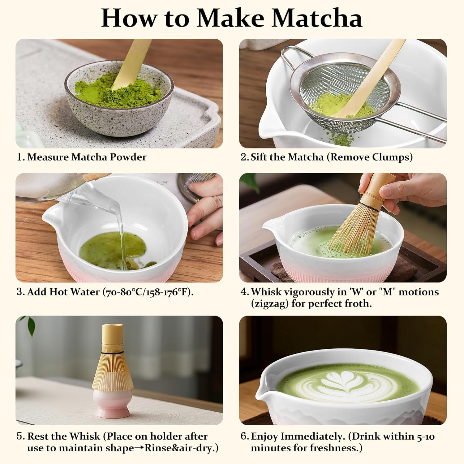 - 【Complete 7-Piece Matcha Set】 Our all-inclusive kit has everything you need: 1*17oz Ceramic Bowl (chawan), 1*Bamboo Whisk (Chasen), 1Stainless Steel Sifter, 1Bamboo Scoop (chashaku), 1Whisk Holder, 1Ceramic Spoon Rest, 1Tea Cloth (chakin), and 1User Manual. Elegantly packaged for an authentic matcha experience. (Matcha powder not included).