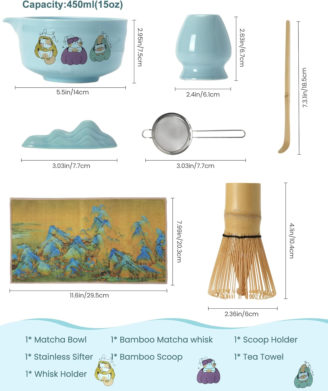 - Complete Matcha Kit – This matcha whisk set includes all essentials for authentic matcha preparation: 1* bamboo whisk (chasen), 1* bamboo scoop, 1* scoop rest, 1* stainless steel sifter, 1* 450ml/15oz ceramic matcha bowl (chawan), 1* whisk holder, and 1* tea towel. A full matcha kit perfect for beginners or experienced tea lovers.