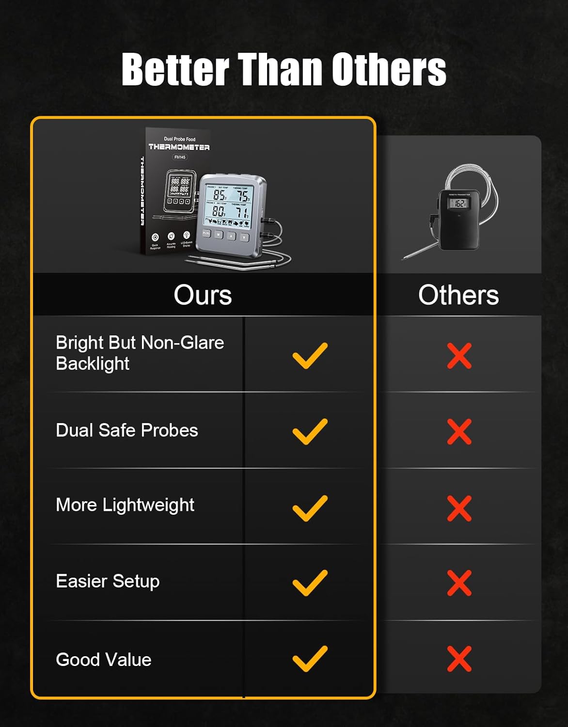 - ăEasy Operation with a Large DisplayăEach button on this smoker thermometer is dedicated to a single function, making it easy to use and remember. The lightweight body, integrated back magnet, and kickstand allow for portability and storage, while the large screen and bright backlight deliver clear readings in darkness or from a distance