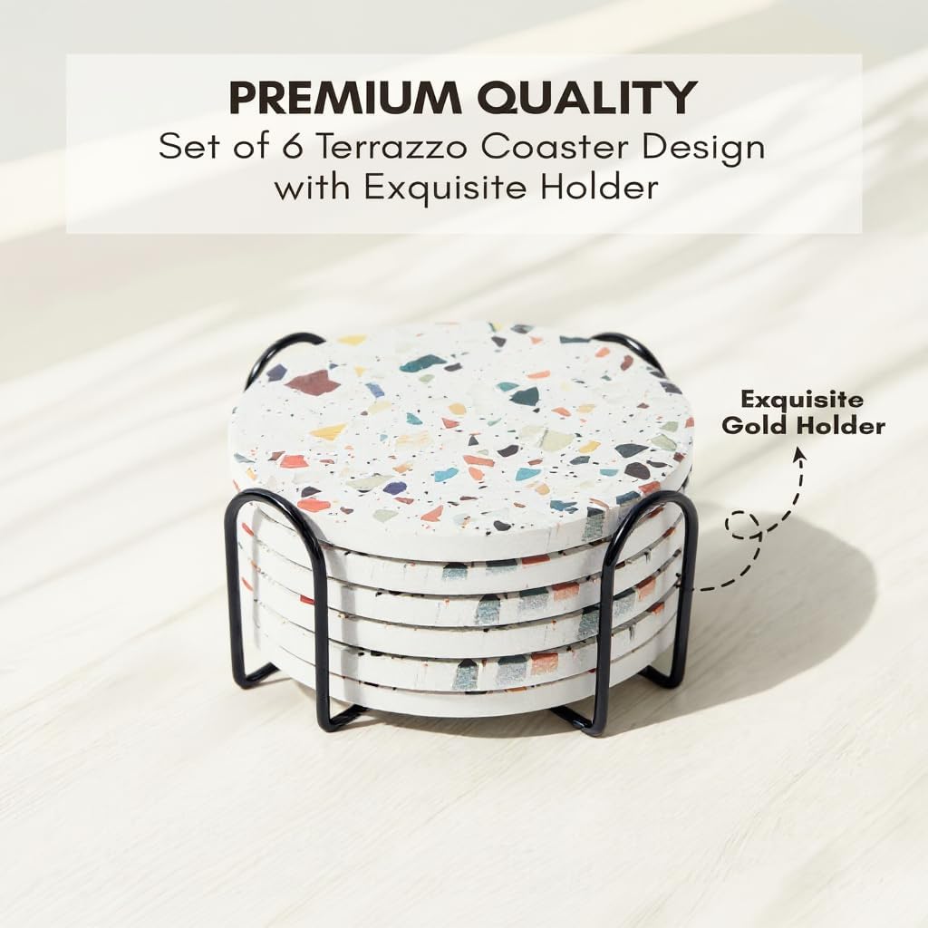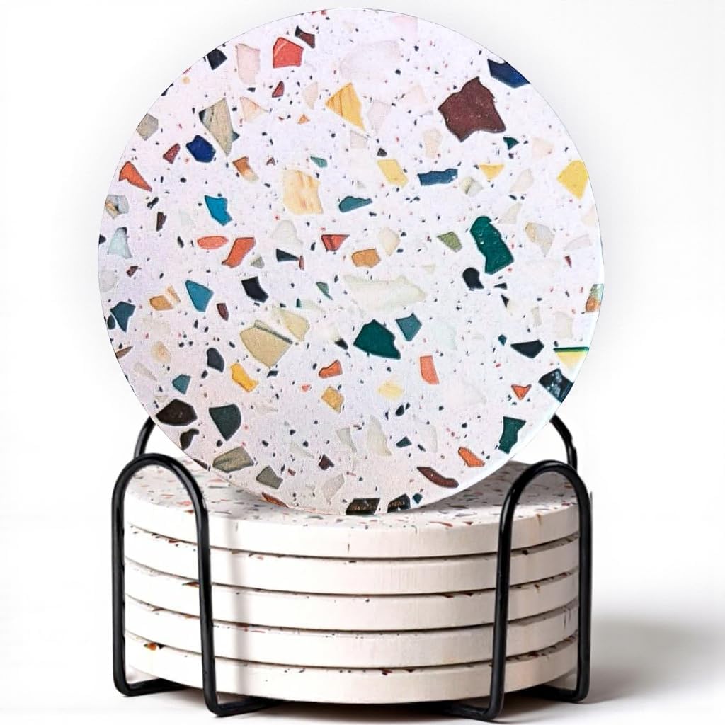 - Modern Terrazzo Style with Holder - Each drink coasters set of 6 includes a black metal coaster holder for neat storage when not in use. The terrazzo finish blends seamlessly with farmhouse, modern, or minimalist themes, making it suitable for desks, dining tables, or living room coffee table decor.