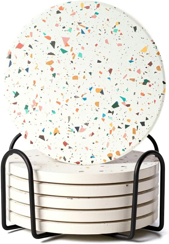 - Modern Terrazzo Style with Holder - Each drink coasters set of 6 includes a black metal coaster holder for neat storage when not in use. The terrazzo finish blends seamlessly with farmhouse, modern, or minimalist themes, making it suitable for desks, dining tables, or living room coffee table decor.