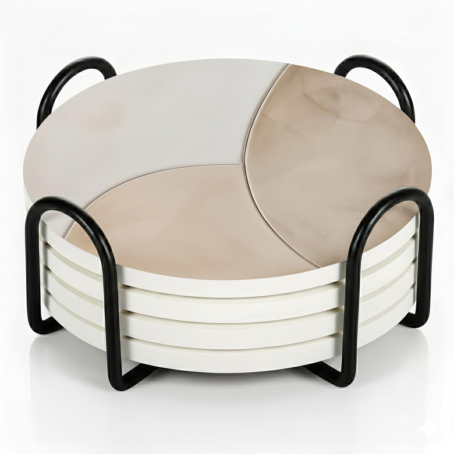 - INSIDE EVERY VEYRO SET: Each set includes 6 ceramic coasters (4" diameter, 0.28" thick) with a matte printed finish and soft cork backing that prevents slipping while creating a subtle floating effect, plus a sturdy black metal holder in smooth matte finish, all packed in a gift-ready box. The size was chosen with intention — wide enough for tumblers, mugs, wine glasses, or cocktails, yet balanced for smaller cups, candles, or planters. Each coaster carries a satisfying weight that feels premium in hand, combining elegance with everyday function to create a versatile piece that protects and decorates beautifully.