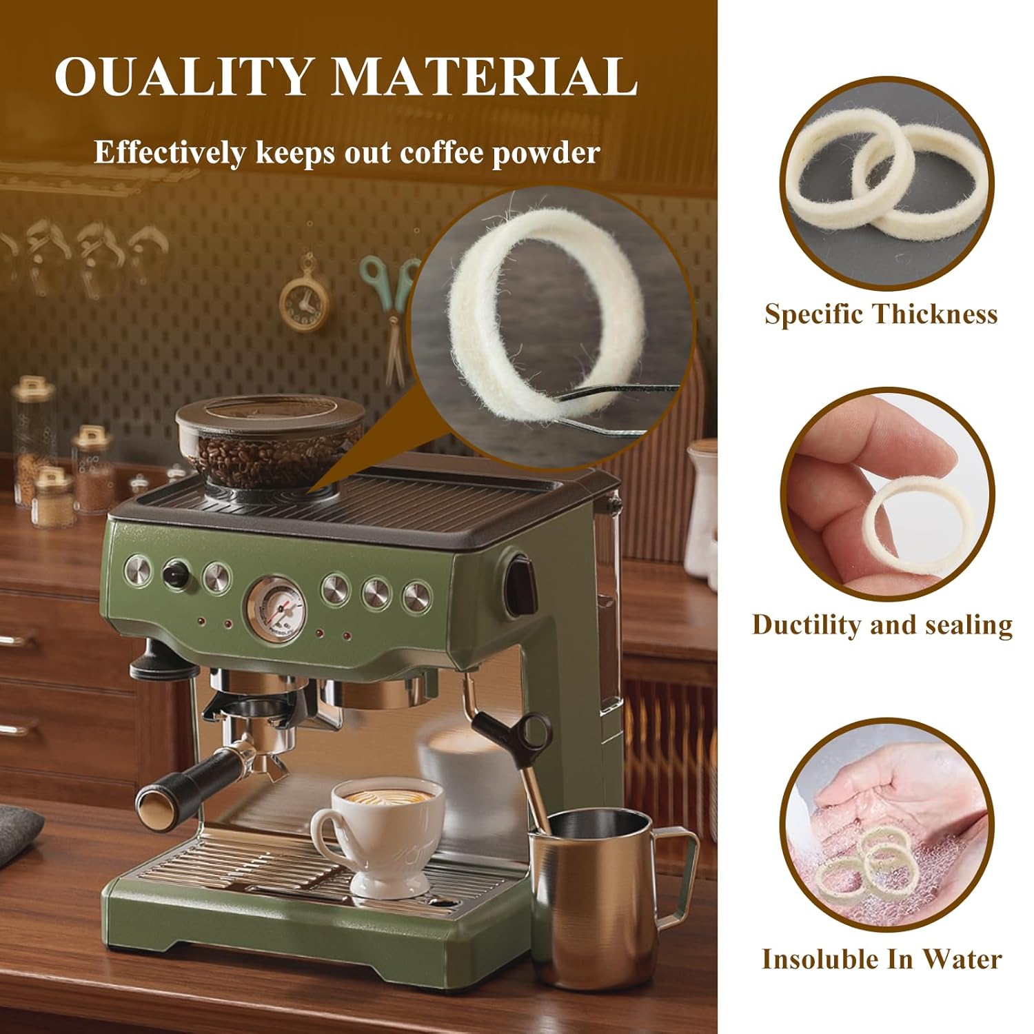 - Premium Material: Made from high-quality wool, the felt gasket is soft, water-resistant, and maintains its shape even after prolonged use. It effectively absorbs moisture, preventing leaks and ensuring consistent performance. This durable material is designed for long-term, reliable use, providing a reliable seal for your espresso machine