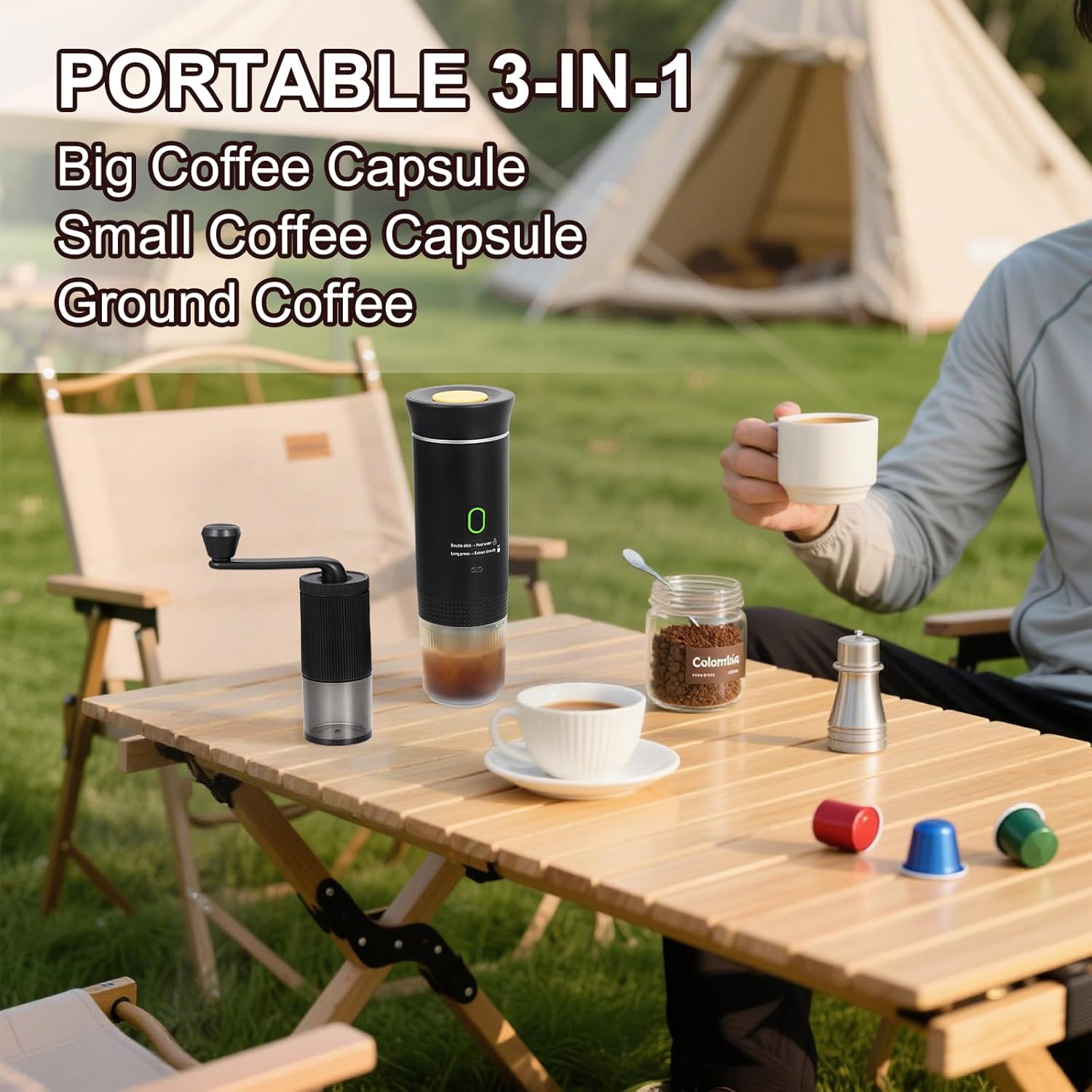 - 3-in-1 Espresso Machine: This portable coffee maker with convenient USB charging cable, work with ground coffee, NS/DG capsules, or freshly ground beans. Double-click with cold water to enter boiling mode (orange light flashes)—it auto-extracts once heated. Long-press 2 seconds (green light flashes) for direct extraction with cold/hot water. Simple, smart, and ready whenever you need a fresh cup