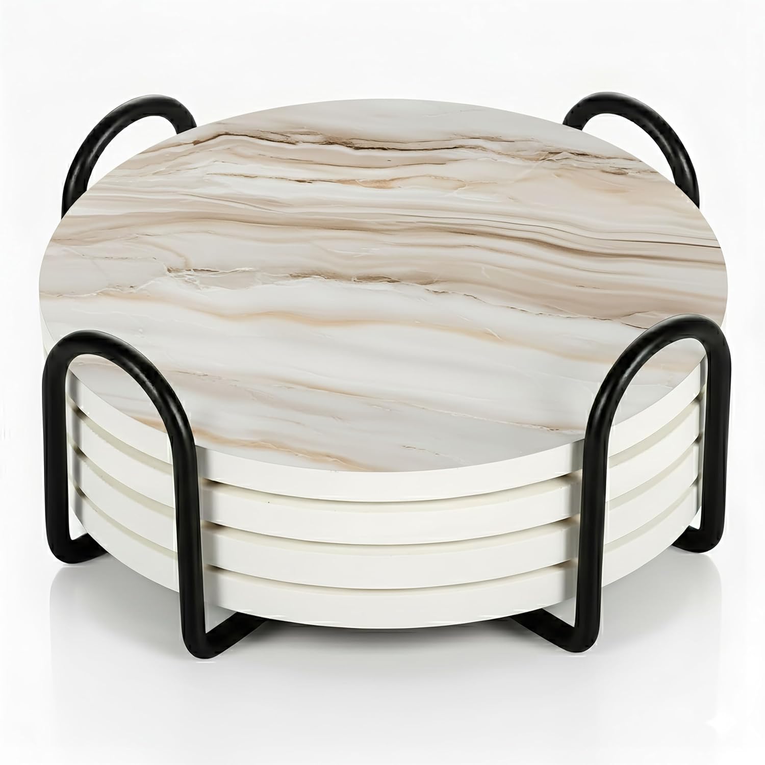 - INSIDE EVERY VEYRO SET: Each set includes 4 ceramic coasters (4" diameter, 0.28" thick) with a matte printed finish and soft cork backing that prevents slipping while creating a subtle floating effect, plus a sturdy black metal holder in smooth matte finish, all packed in a gift-ready box. The size was chosen with intention — wide enough for tumblers, mugs, wine glasses, or cocktails, yet balanced for smaller cups, candles, or planters. Each coaster carries a satisfying weight that feels premium in hand, combining elegance with everyday function to create a versatile piece that protects and decorates beautifully.