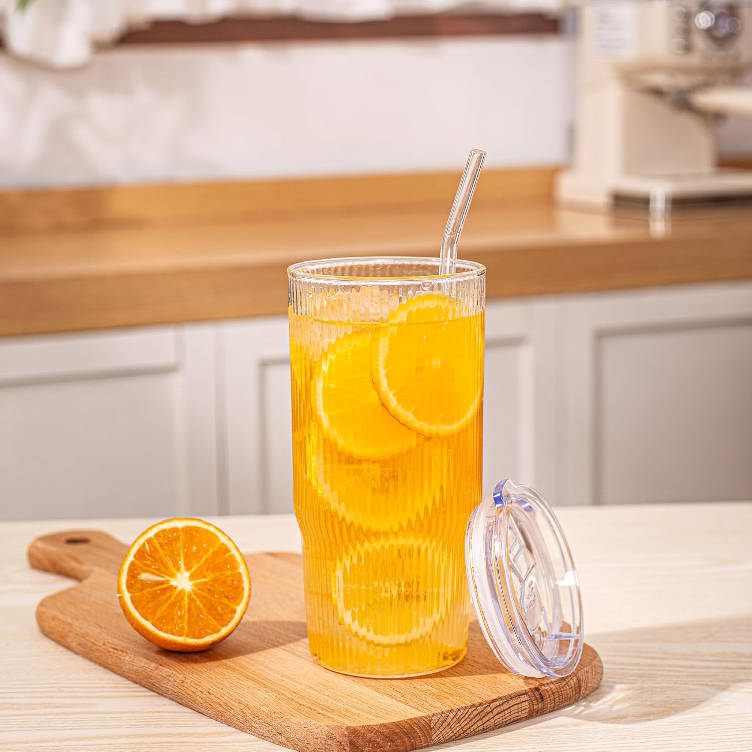 - Glass Tumbler with Straw and Lid: 24oz glass cups with lids and straws perfect for savoring iced coffee, creamy smoothies, refreshing juices, or classic cocktails, these ribbed glass tumblers are perfect for any beverage