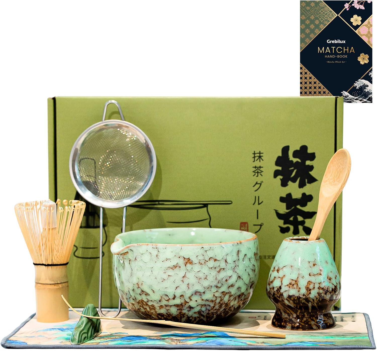- Complete 9-PCS Matcha Kit: Includes 1*530 ml/18 oz Ceramic Matcha Bowl, 1*Matcha Whisk, 1*Whisk Holder, 1*Matcha Spoon, 1*Tea Scoop, 1*Scoop Rest, 1*Tea Mat, 1*Matcha Sifter and 1*Hand book. This comprehensive set makes it easy for beginners to master matcha preparation at home and enjoy the art of matcha.