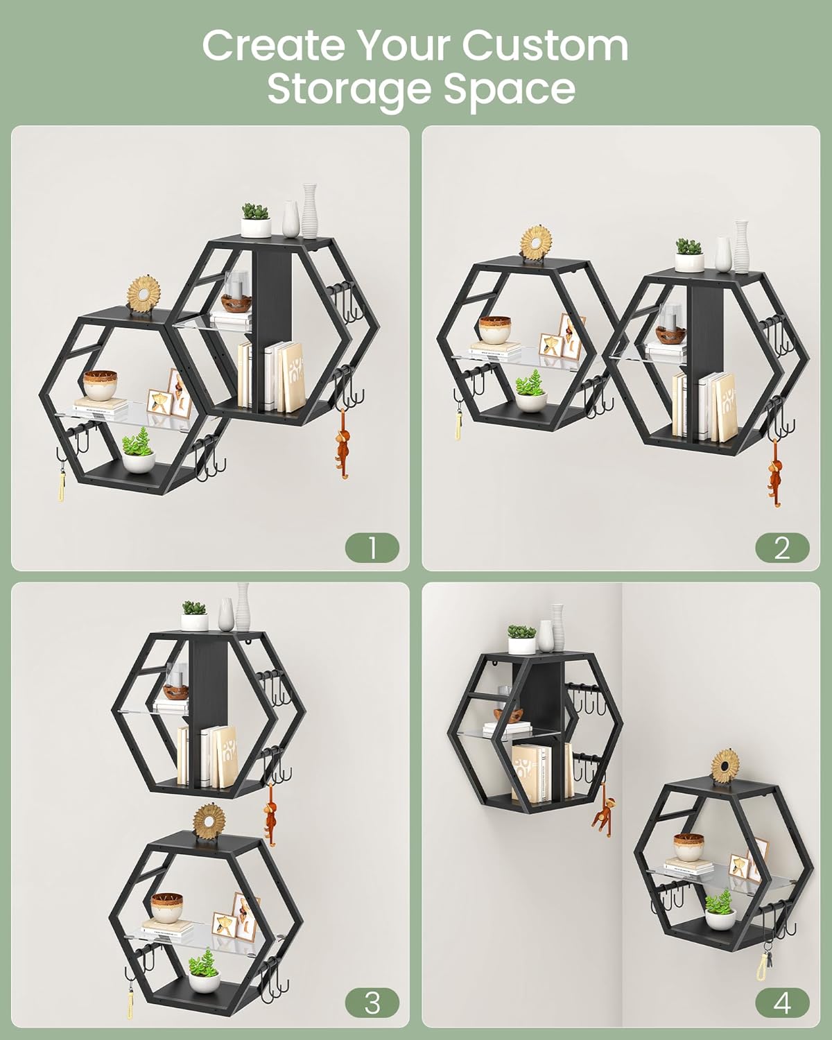 - DIY Wall Shelves: Inspired by the honeycomb's hexagon structure, the set of 2 wall shelves enhances flat walls with a striking three-dimensional effect and elevated aesthetics. Enjoy the flexibility to use them individually or combined into your preferred layout