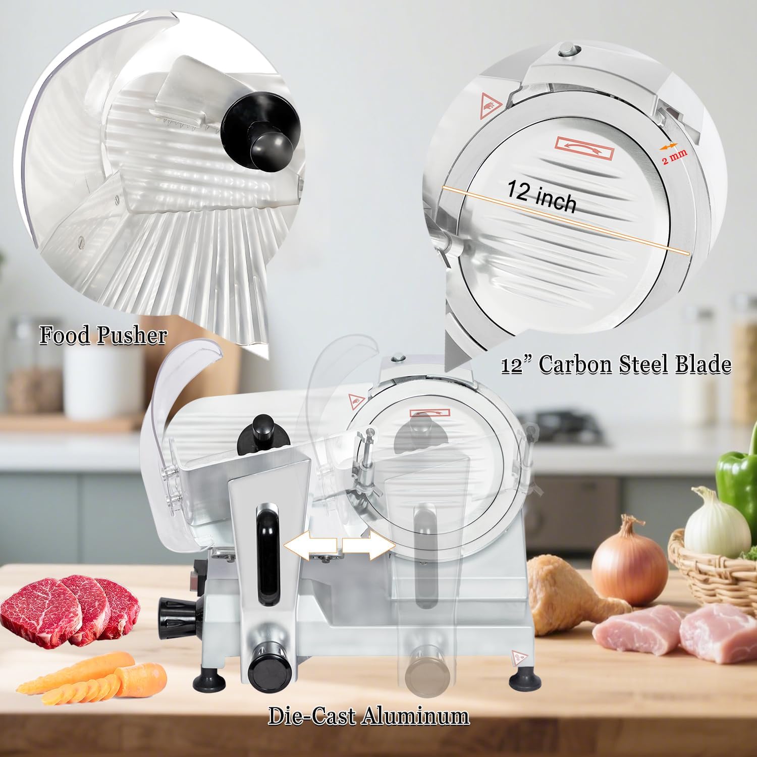 - Premium Materials for Superior Durability: This commercial meat slicer boasts a die-cast aluminum body and 12-inch carbon steel blade. Made with high-quality materials, it delivers strong rust and corrosion resistance. The blade stays exceptionally sharp for faster, more efficient cuttingāensuring long-term stable performance. (Note: The meat slicer produces operational noise, with a sound level below 55 decibels.)