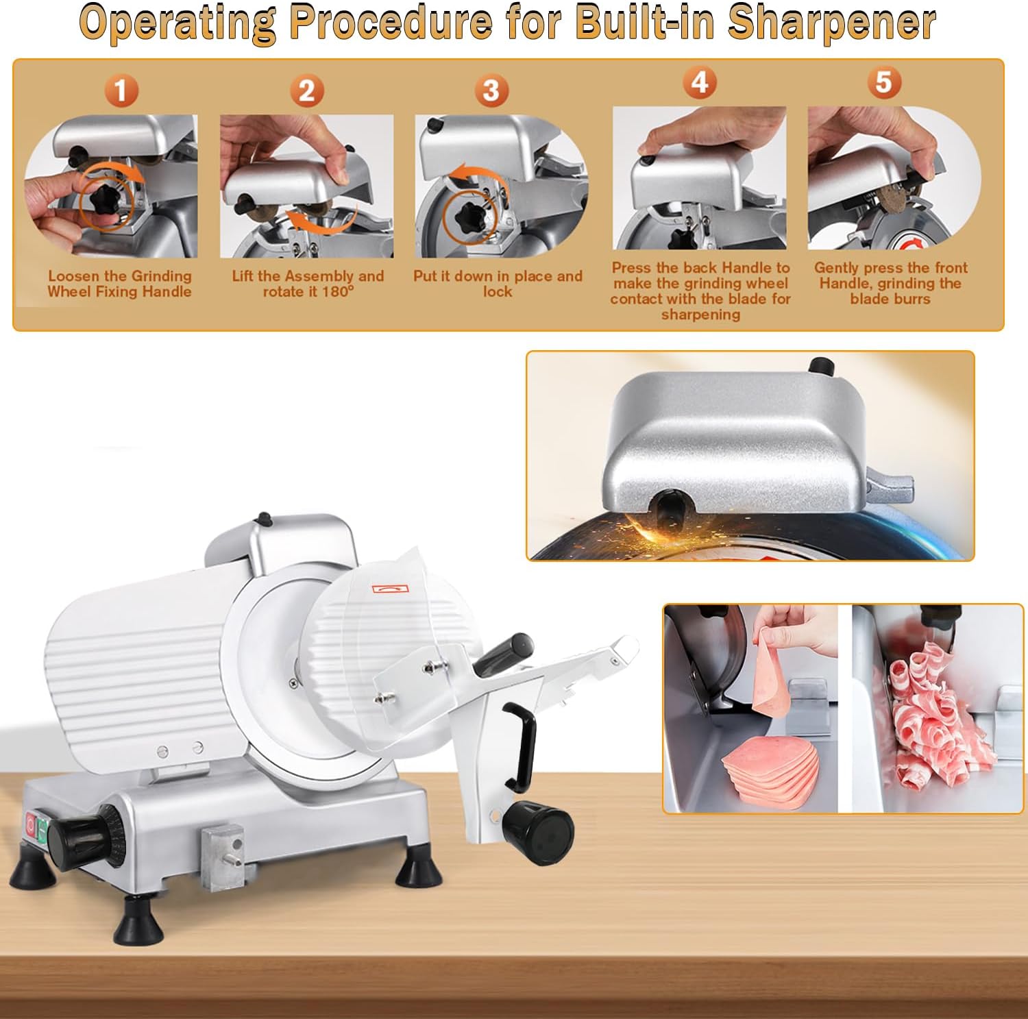 - 250W High-Efficiency Motor: This meat slicer is equipped with a 250W motor, delivering powerful performance with a speed range of 350-400 RPM. Paired with its sharp blade, it can efficiently slice 40-60 pieces per minute. It also features a built-in dual-stone sharpener for easy blade maintenanceākeeping the blade sharp, preserving cutting efficiency, and enabling quick slicing through various ingredients to significantly boost your workflow.
