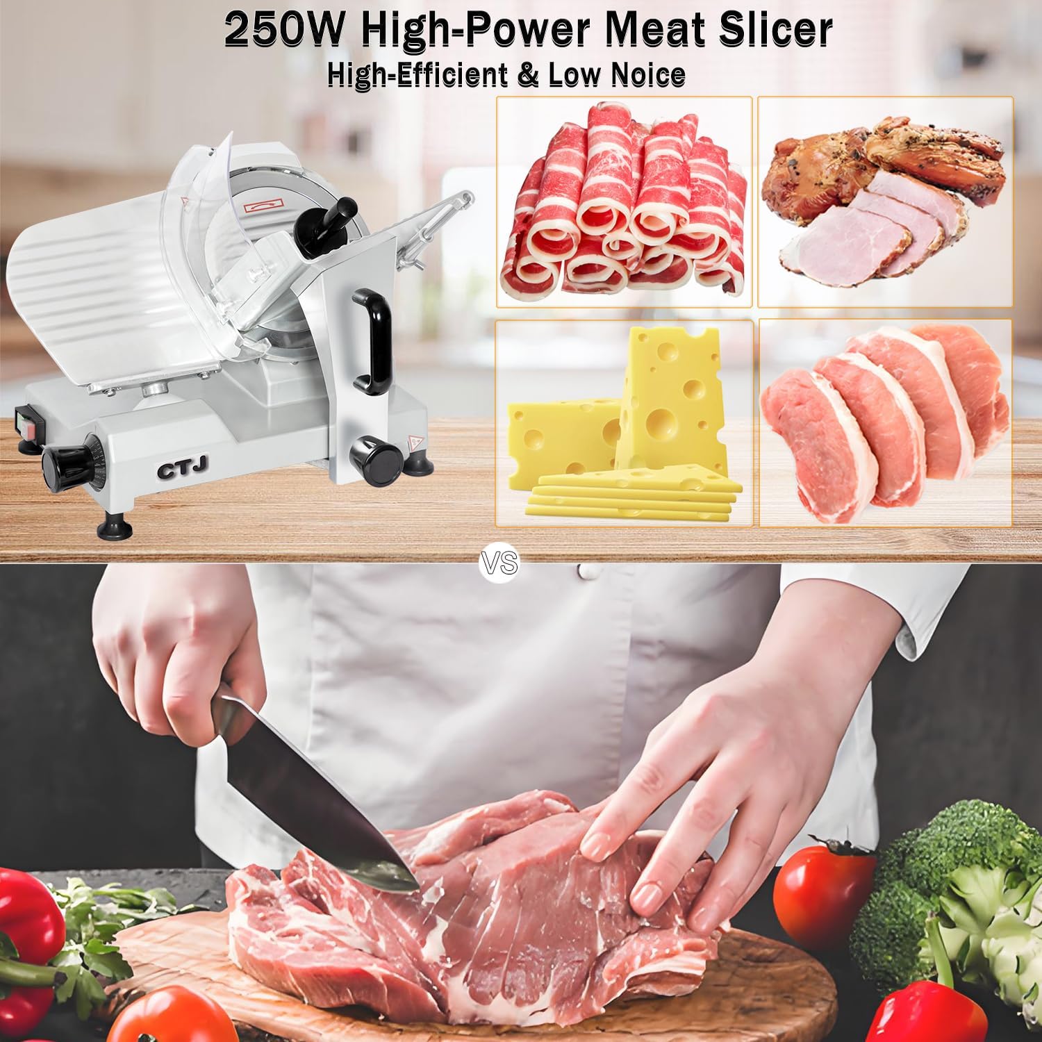 - Versatile Uses: This food slicer works for cutting a variety of ingredients, including meat, deli items, cheese, roast beef, turkey breast, bread, vegetables, and fruits. Itās suitable for both home and commercial settingsāsuch as home kitchens, restaurants, butcher shops, and cafeterias. (Note: Frozen meat needs 15 mins of room-temp thawing. Hard cheeses, bread, veggies: slice directly. Fresh meat/soft foods, though, should be frozen first for best slicing results.)