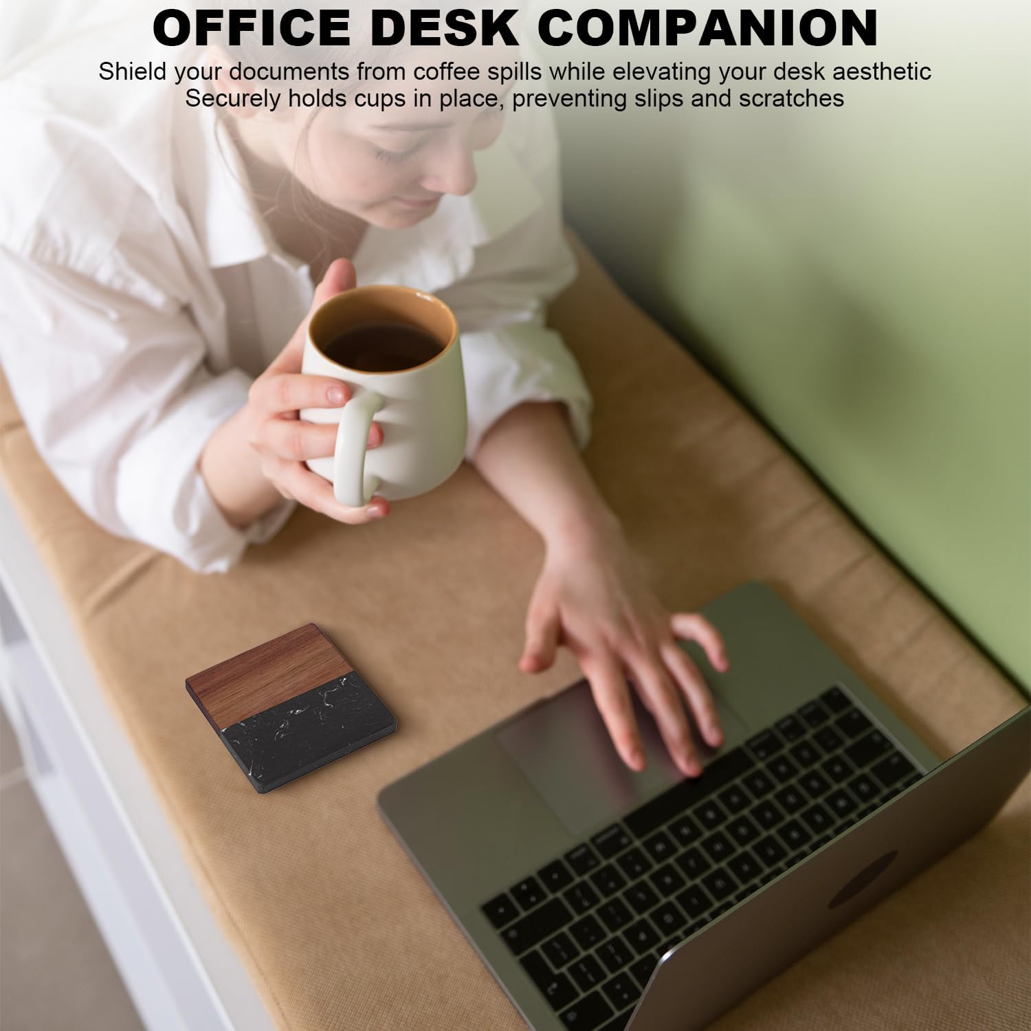 Marble Coasters: 4-Piece Set of Acacia Wood Marble Coasters, Suitable for Kitchens, Offices, and can be Used as Gifts (Black Square)