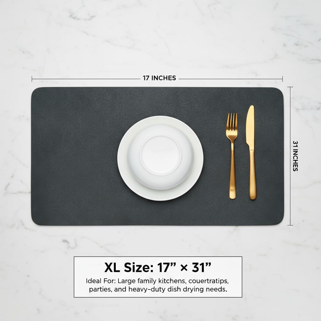 Dish Drying Mat Super Absorbent – 17" x 31" Coffee Mat for Countertops – Non-Slip Drying Mat for Kitchen Counter – Easy to Clean Water Absorbent Mat – XLarge Dish Drying Mats (Dark Gray)