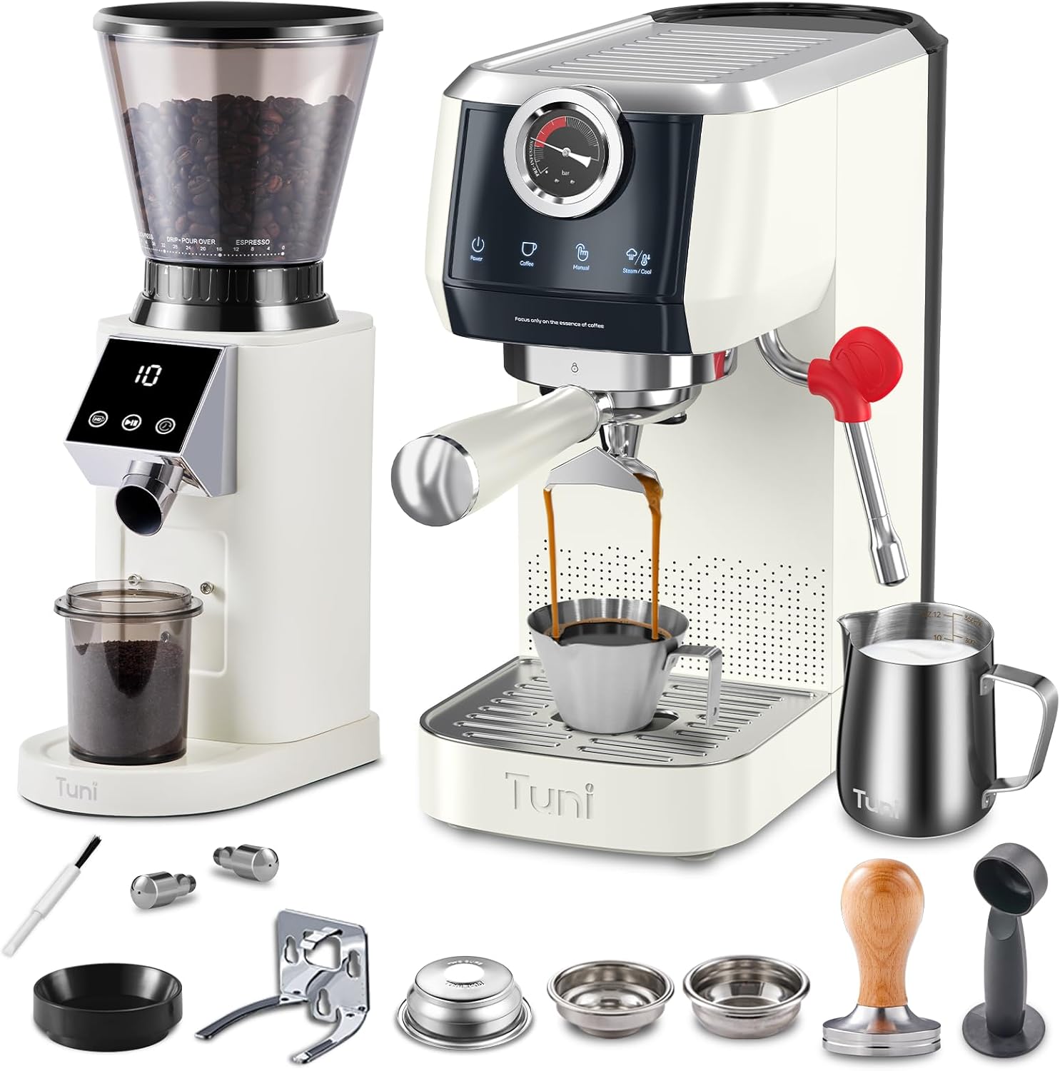 Tuni E2 ๐ฌ๐๐๐๐๐๐๐ ๐ด๐๐๐๐๐๐ with G1 ๐ช๐๐๐๐๐๐ ๐ช๐๐๐๐๐ ๐ฎ๐๐๐๐ ๐๐ Combo Set, 20Bar 58mm Dual Boiler Coffee Maker, 48 Grinding Settings Burr Mill