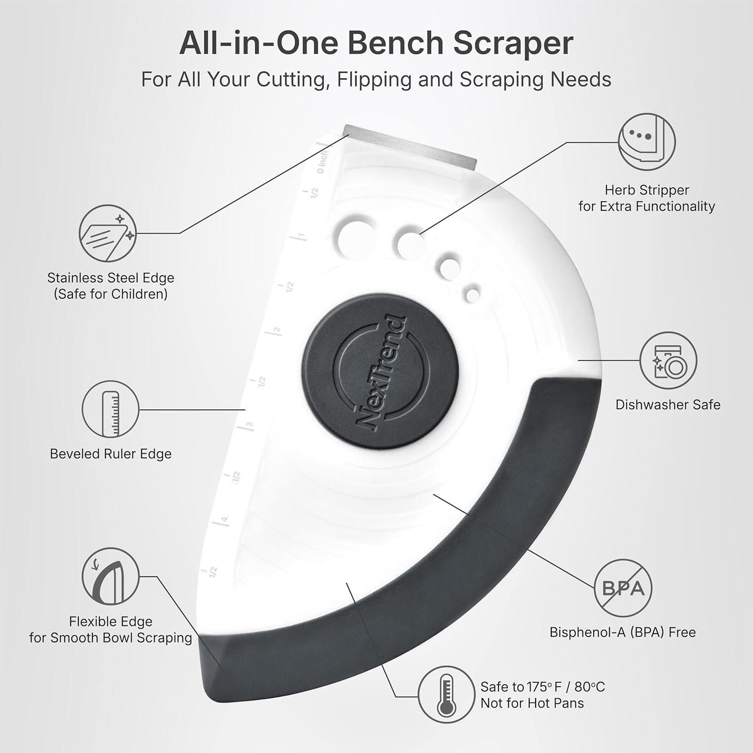 - BUILT-IN RULER & HERB STRIPPER – Nextrend's bench scraper for bread dough tool measures with 1/2" increments and strips fresh herbs in seconds.
