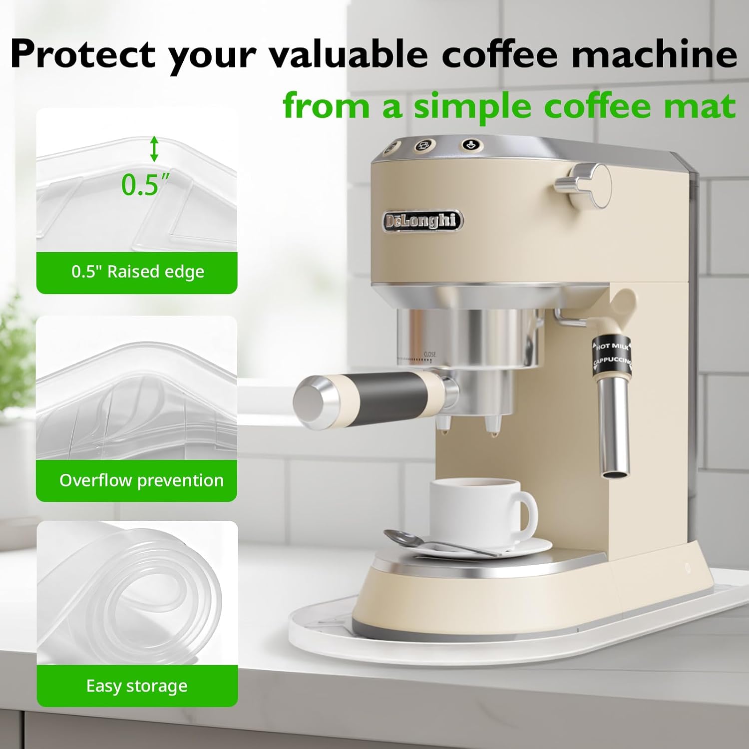 - Protect Counters & Appliances:Our coffee bar mat made of high-temperature resistant silicone (up to 446°F/230°C), it effectively absorbs heat from the coffee machine, avoiding thermal damage to wooden, marble, or quartz countertops. It also acts as a buffer against accidental spills, keeping both the counter and machine clean