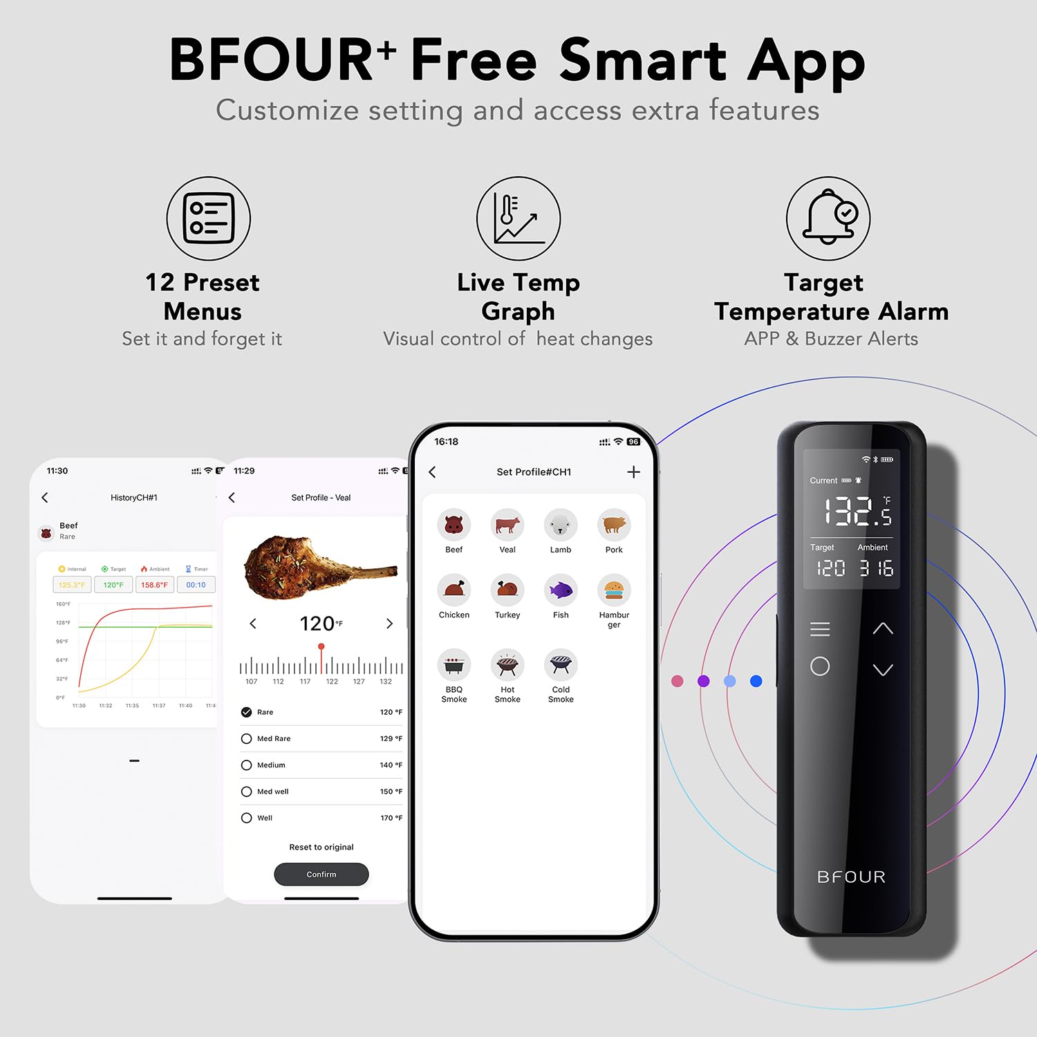 - ăIntuitive Smart AppăTrack real-time temperatures with this intuitive smoker thermometer app. Set target temperatures, customize alarms and timers, and view temperature graphs right on your phone. USDA meat presets make grilling and smoking easier than ever.