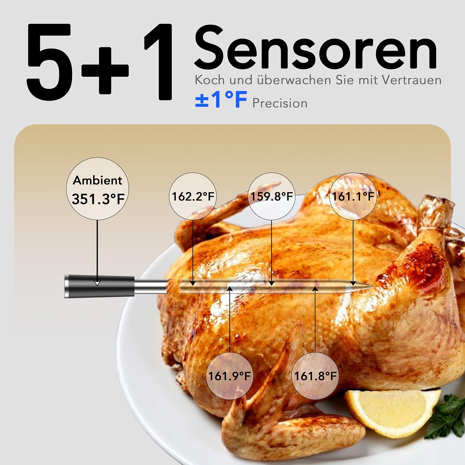- ă5 High-Precision Sensors & Ambient SensorăThis wireless meat thermometer probe features 5 internal temperature sensors and 1 ambient sensor, all with an accuracy of Âą0.9â. Perfect for monitoring multiple types of meat and your grilling environment simultaneously. Get precise, reliable temperatures every time with this Bluetooth meat thermometer.