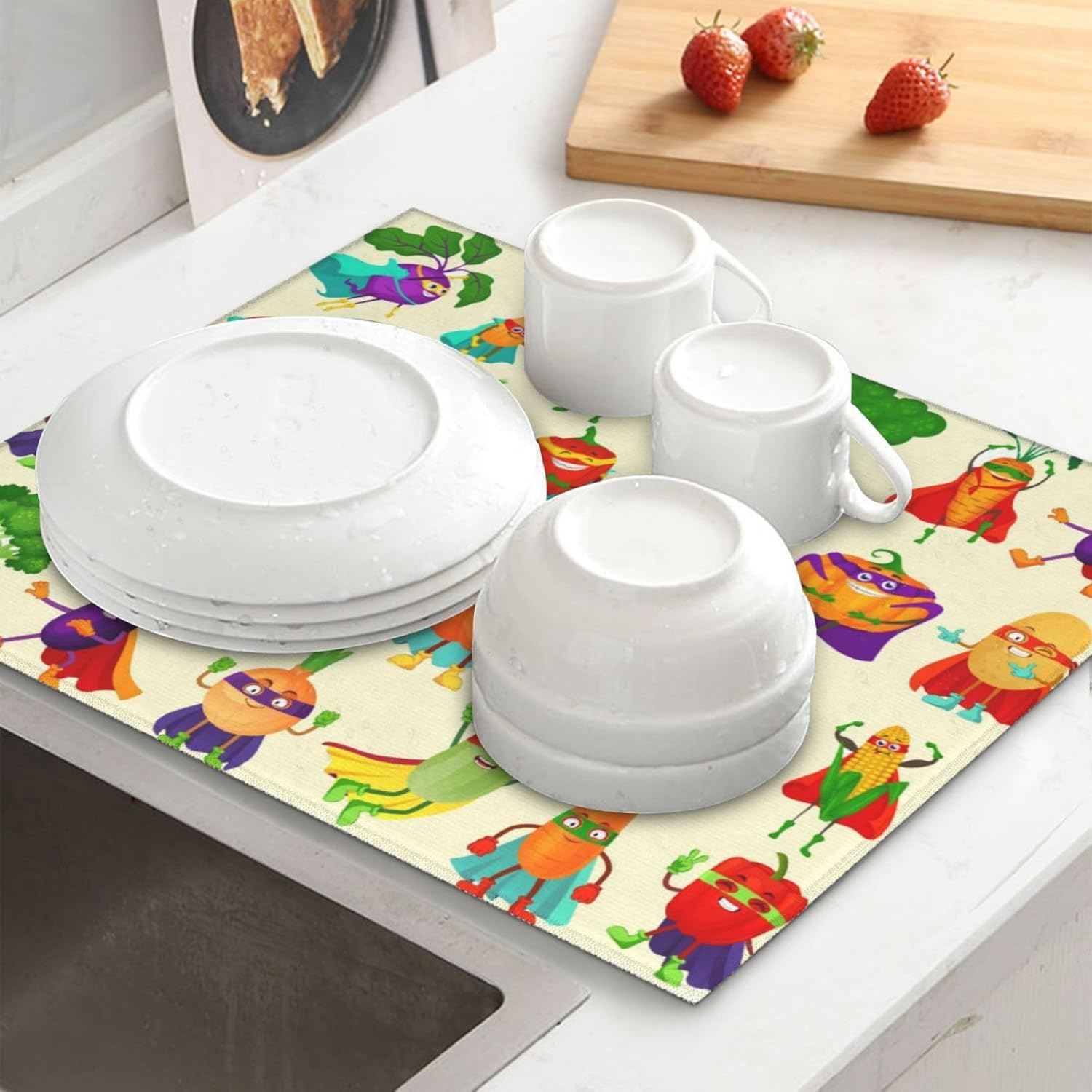 - Premium Microfiber Polyester Material: This cute vegetable superhero cartoon dish drying mat is made of high-quality microfiber polyester, making it an absorbent dish drying mat that efficiently soaks up water, keeping your kitchen counter dry. As a microfiber dish drying mat, it ensures durability and long-lasting use, ideal as a dish drying pad for kitchen counter